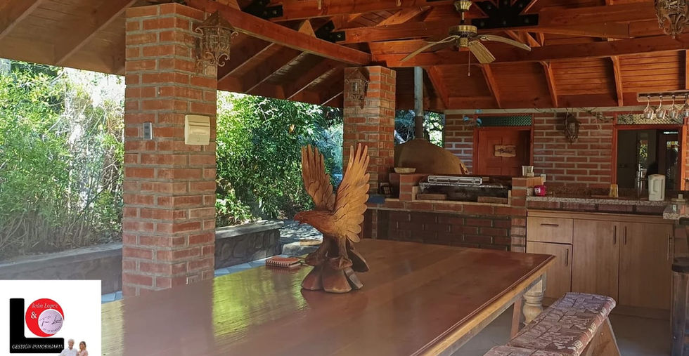 Tiene un quincho de 143 mt2 sobre piso de hormigón, pilares de ladrillo, cubierta con techo de madera con teja chilena. Asadera, lavaplatos. Horno de barro con termostato. Gran sala de baño. Sala totalmente equipada como sauna seco.